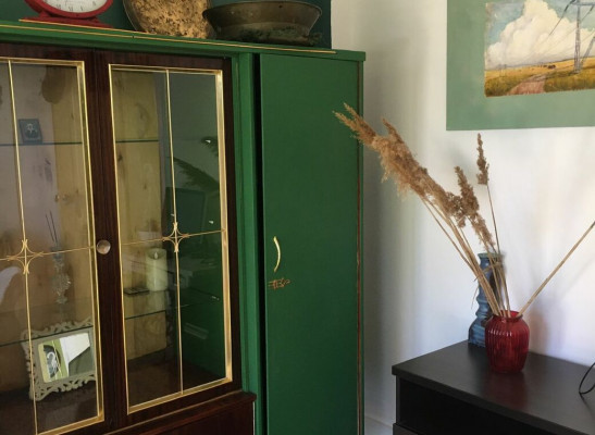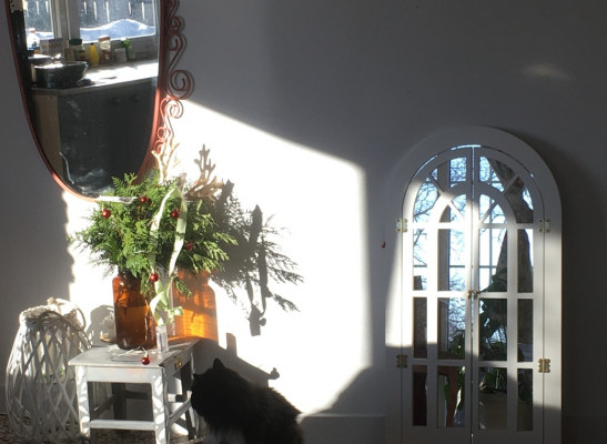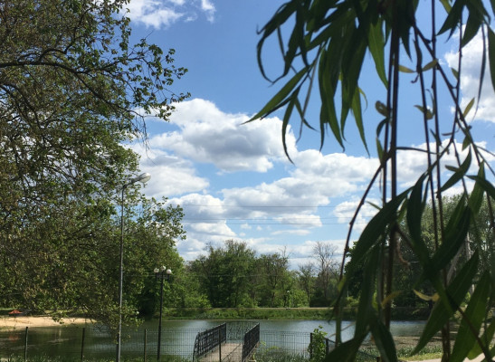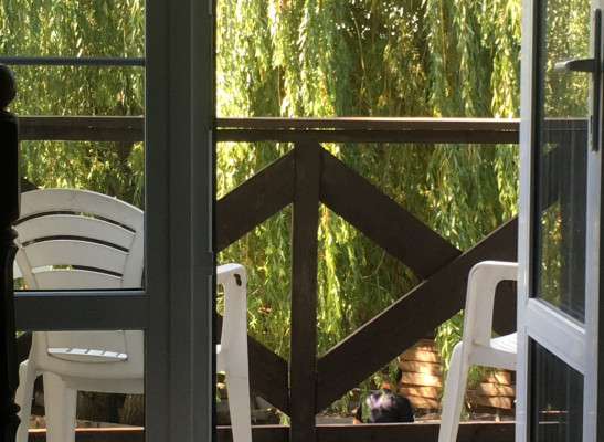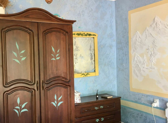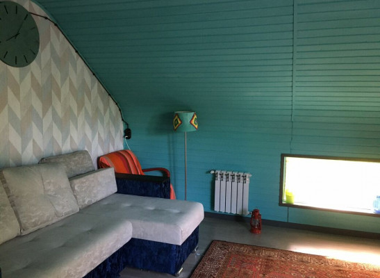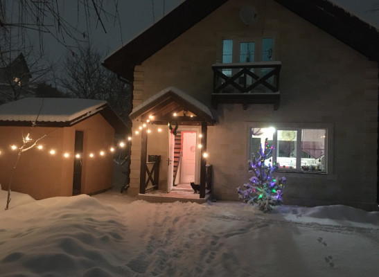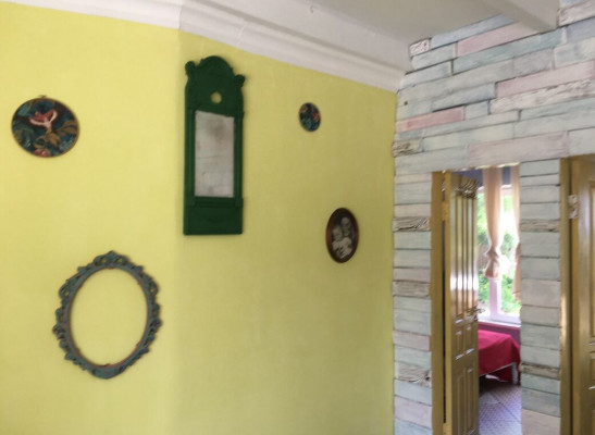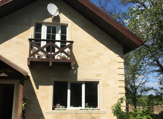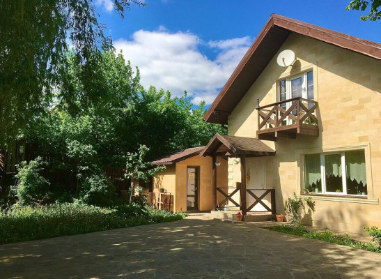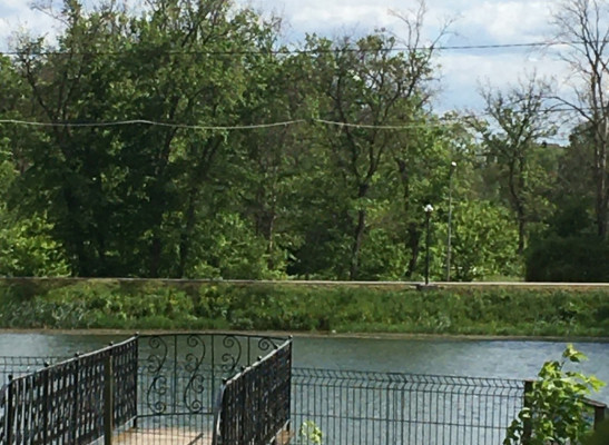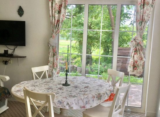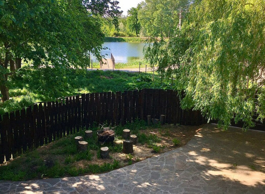 Домик с видом на поле и на озеро в парке. Забор деревянный. Три спальни, кухня гостиная, двор устлан диким камнем.