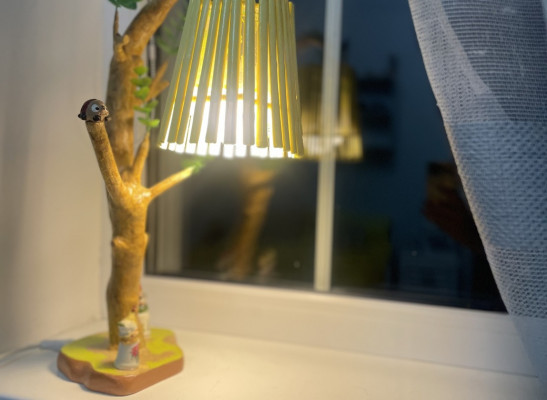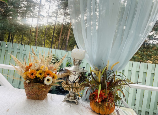 Первый этаж: открытая терраса с видом на лес, прихожая, спальня, гостиная с камином и эркерными окнами, кухня, туалет. Спальня с окнами в лес.