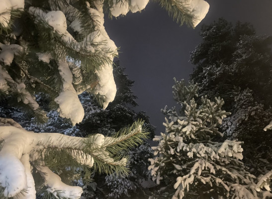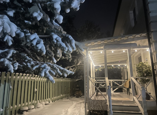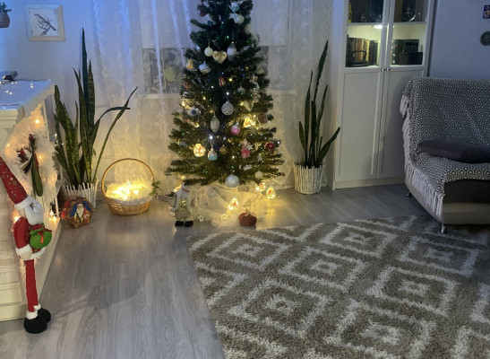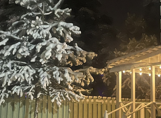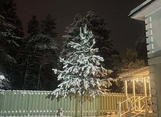 На участке хоз. блок и площадка под авто, сосны, цветы. Деревья, газон.