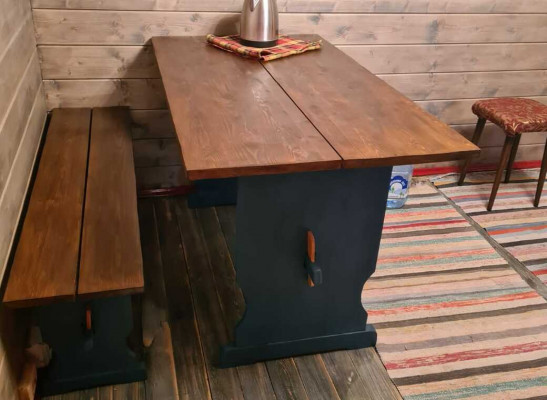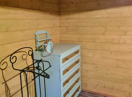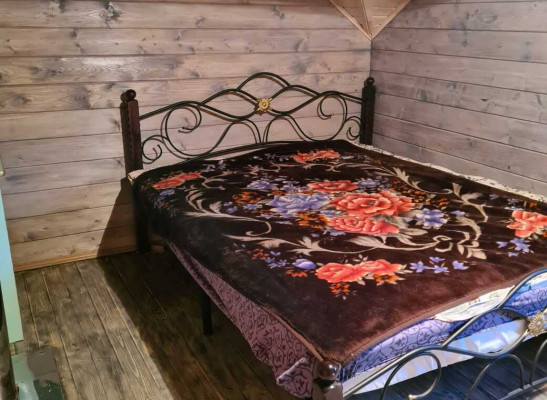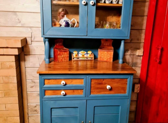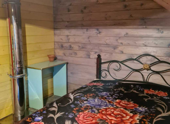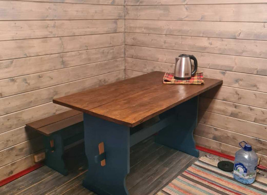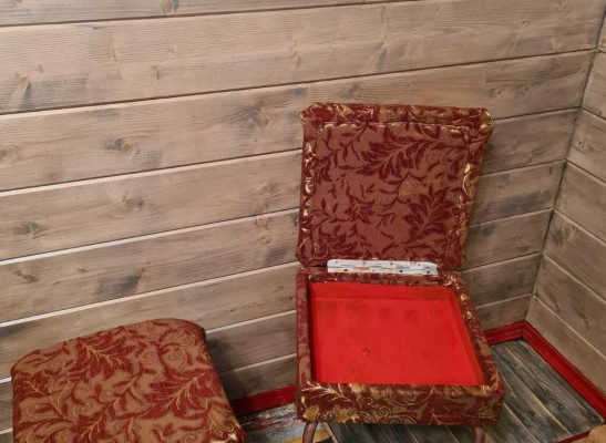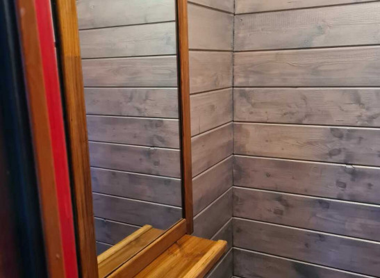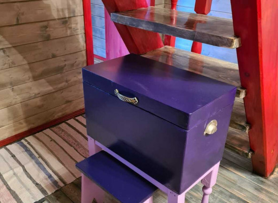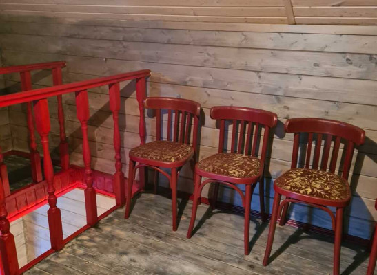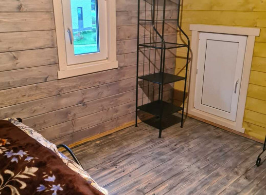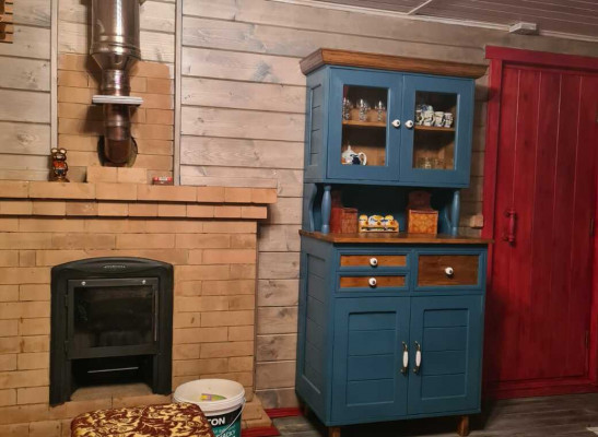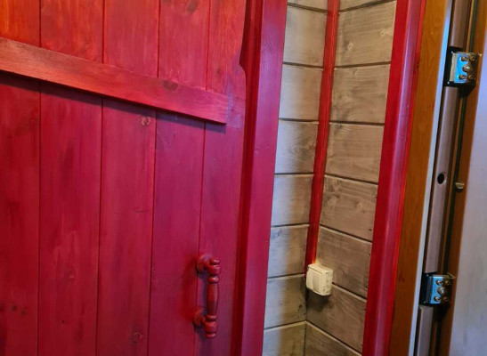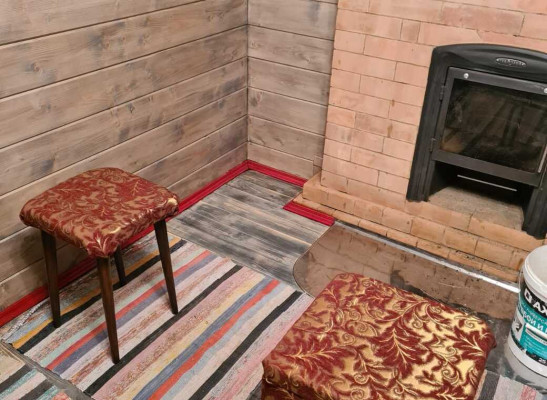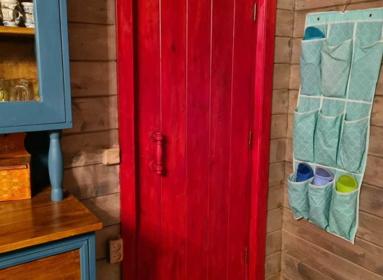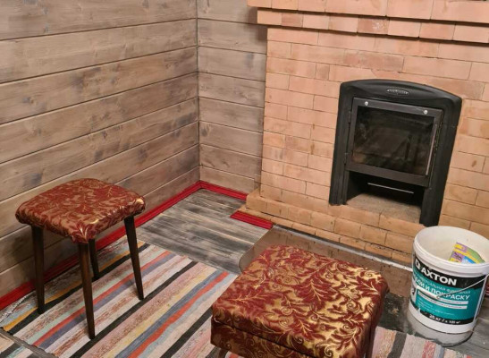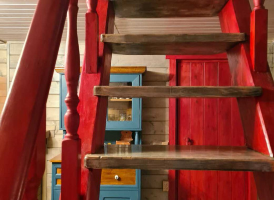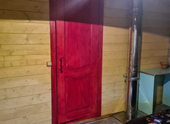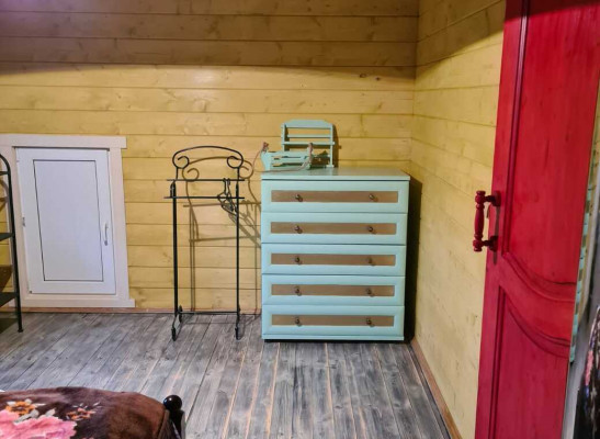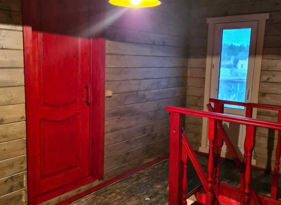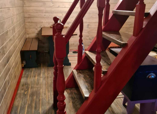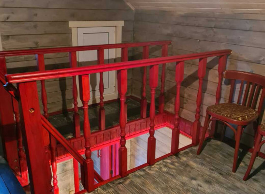 Интересный интерьер бани. Можно использовать как домик. Есть комната отдыха с красивой печкой, интересным интерьером, спальня, покрашена в два цвета, желтый и синий. Так же есть ещё пустая комната, красивая лестница красного цвета. Двери так же в красном цвете. Яркий дизайн.