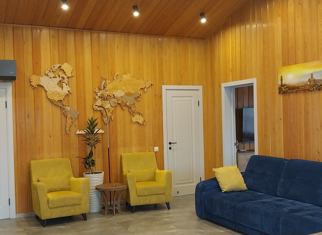 Финская сауна с печью НАRVIА, нагревается до 110 градусов в течении часа. Пологи изготовлены из южно-африканского абажа (не обжигают во время парения), на стене натуральное пано из можжевельника. Камень жадеит и нефрит дают сухой пар, при котором комфортно дышать.