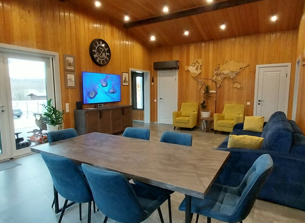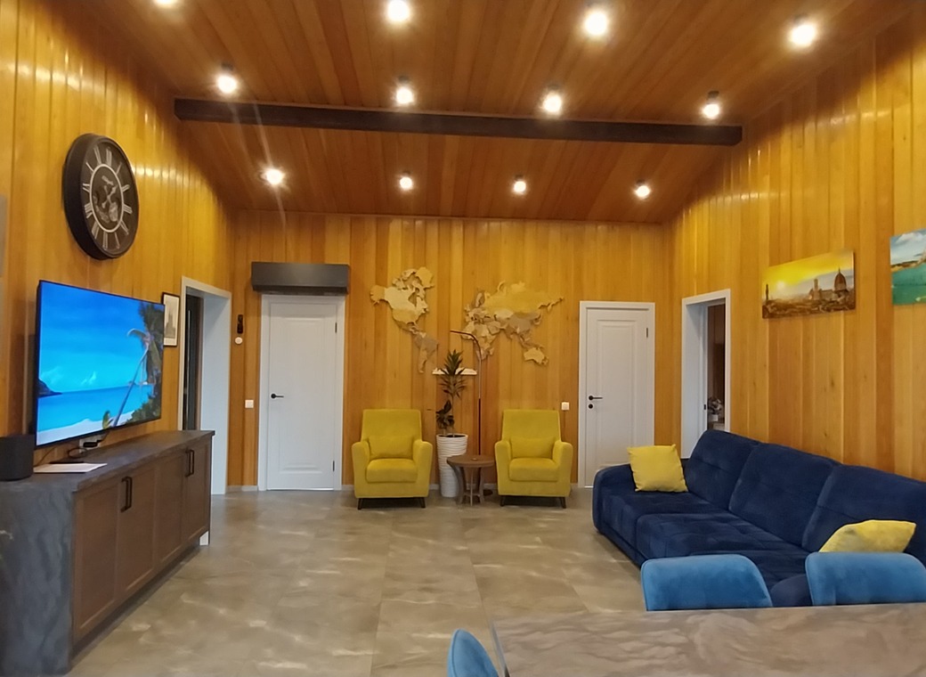Просторная кухня-гостиная с большим диваном производитель Pushe (дополнительное двуспальное место). Установлен кондиционер Electrolux и телевизор Samsung с диагональю 65, станция Алиса.