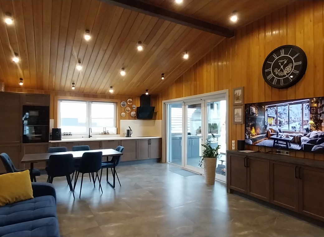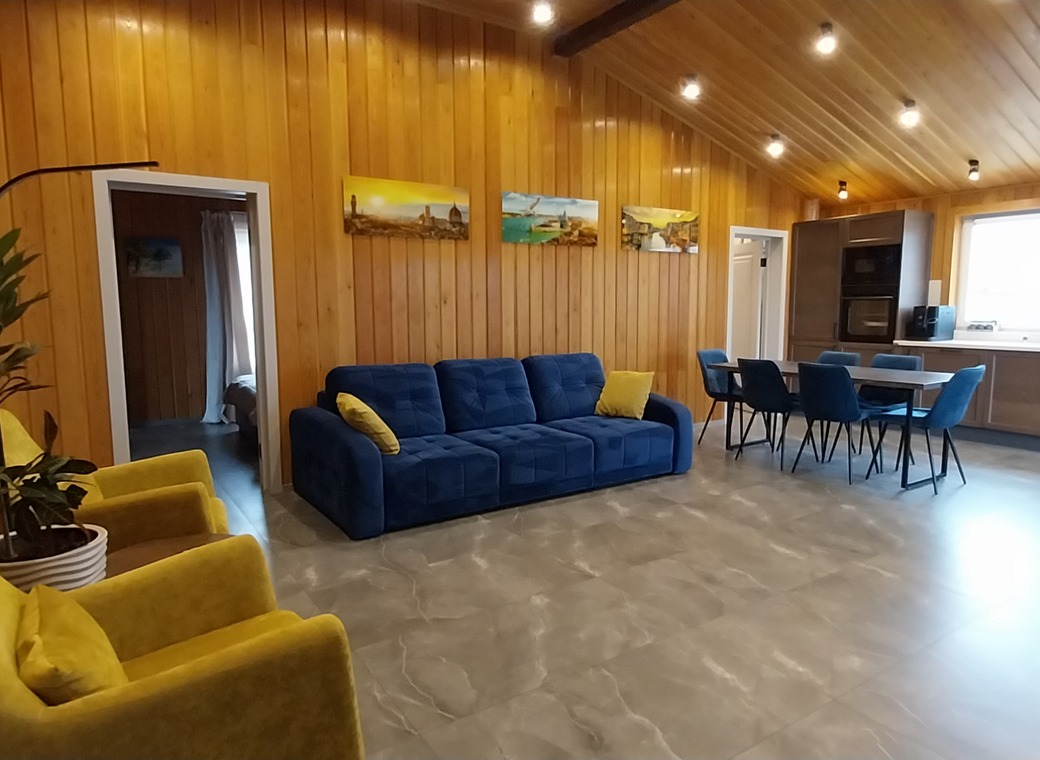 Светлая гостиная и кухня от производителя Мария - единое целое, фасады из массива ясеня, столешница из искусственного камня. На кухне вы найдёте абсолютно всё: варочная индукционная поверхность Gorenje, духовка gorenje, посудомоечная машина, кофемашина Nivona 8101, электрический чайник,встроенные холодильник и морозильная камера Gorenje, микроволновка Gorenje, блендер, посуда и столовые принадлежности (от кастрюль и сковородок до вилок, ложек, бокалов). Обеденный стол 180 на 85 см. для комфортного размещения 6 человек.