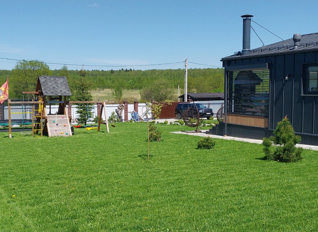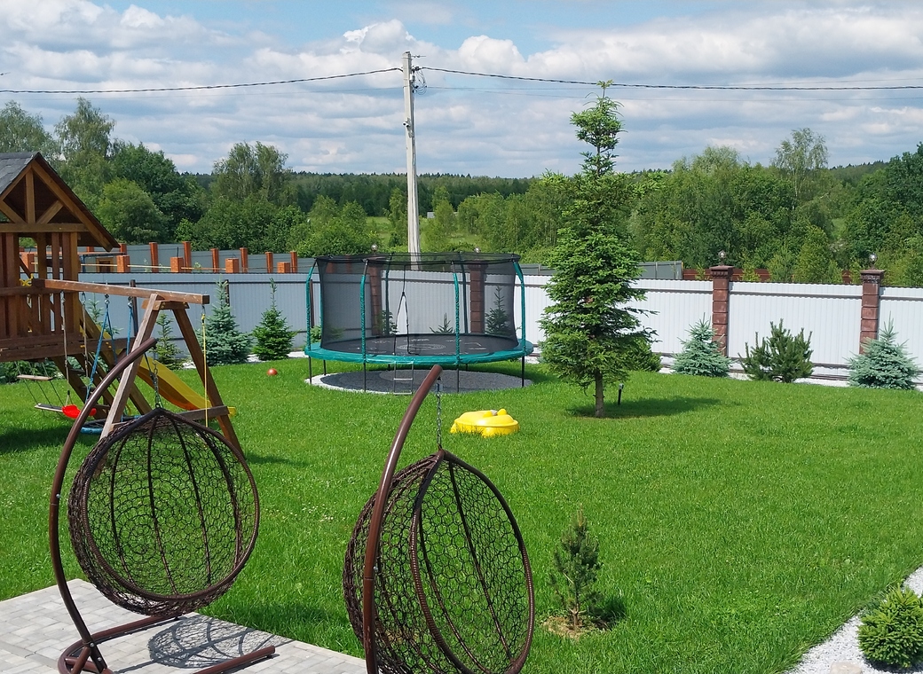На участке расположена детская площадка с горкой и качелями, батут диаметром 4.5 метра, песочница для малышей с кварцевым песком.