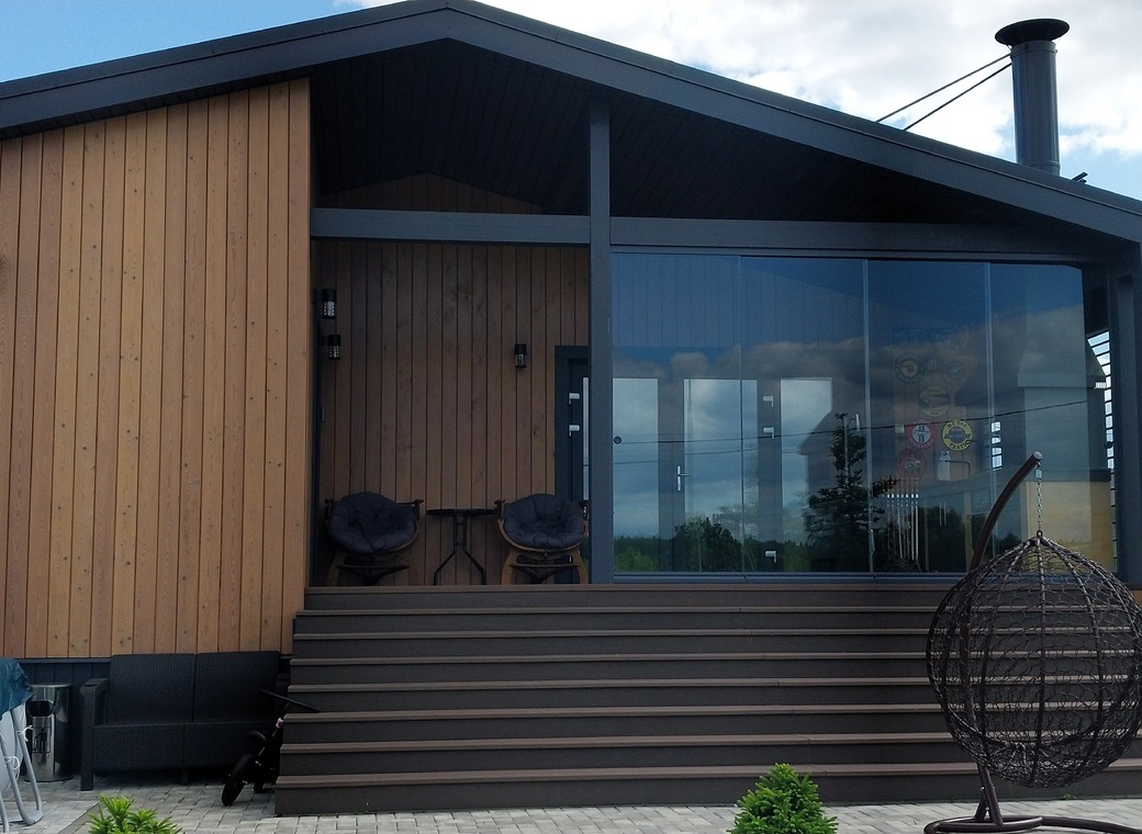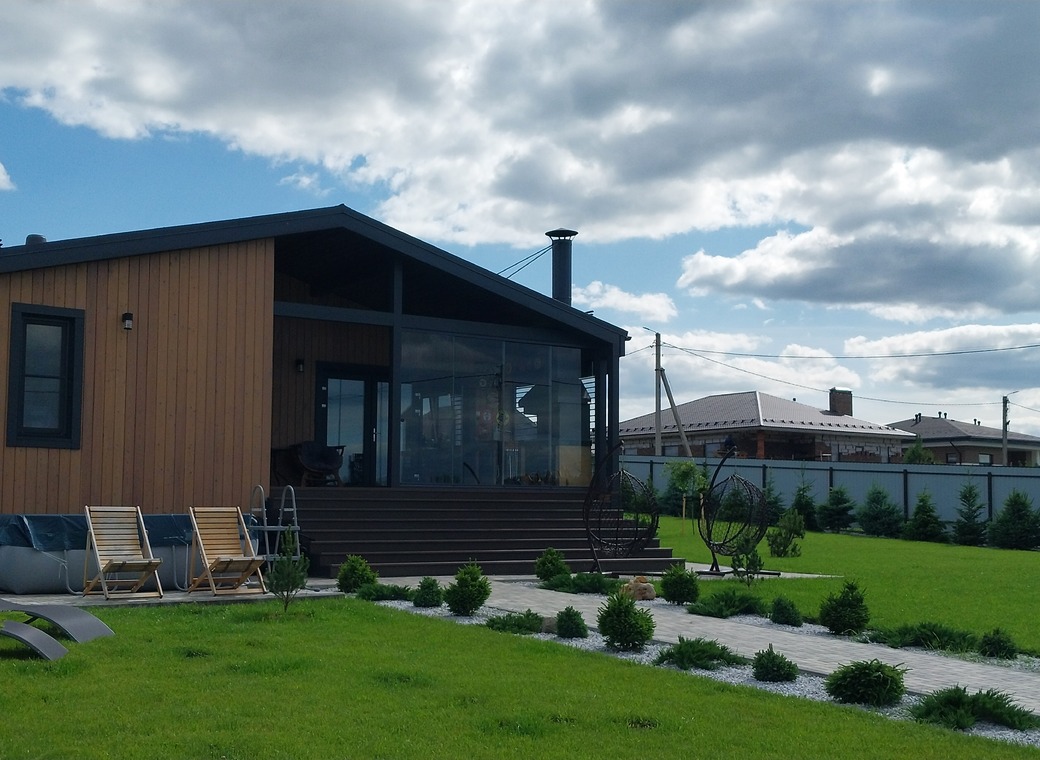 Дом построен по каркасный технологии, в стиле барн-хаус.