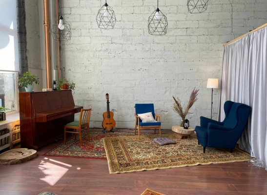 г) Отдельное помещение, комфортное помещение под плейбек/грим-костюм. Дополнительно на этаже есть гримерки. Барная стойка, полностью укомплектованная для буфета (куллер, микроволновая печь, холодильник, кофемашина)