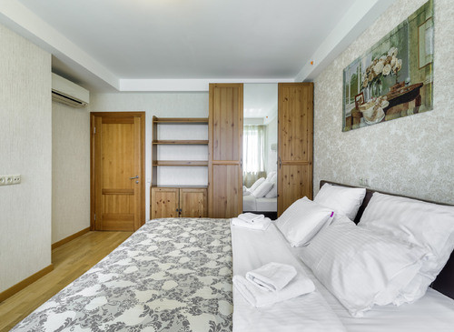 Спальные места: 2 + 2 + 2 + 1 + 1 + 1. Двуспальная кровать в спальне, два односпальных дивана в гостиной на первом этаже, две двуспальные и одна односпальная кровать в спальнях на втором этаже. Не