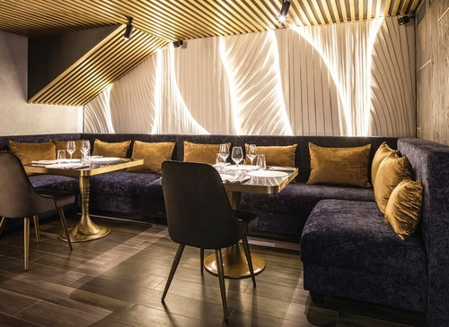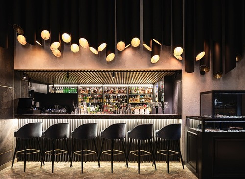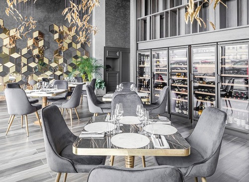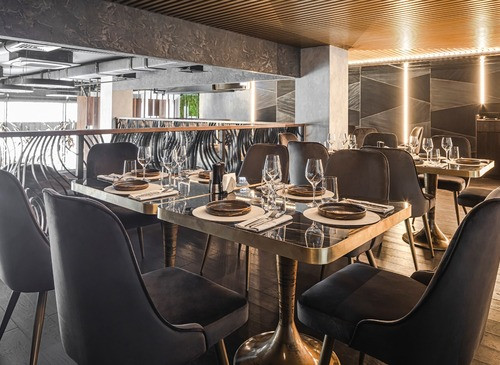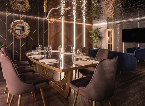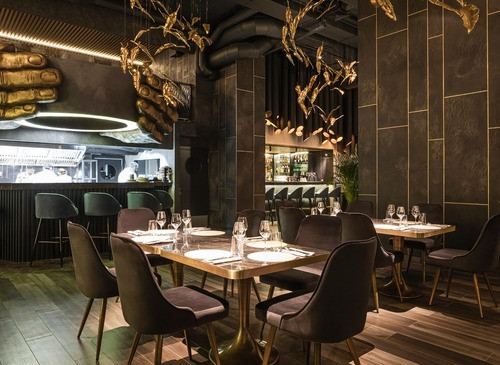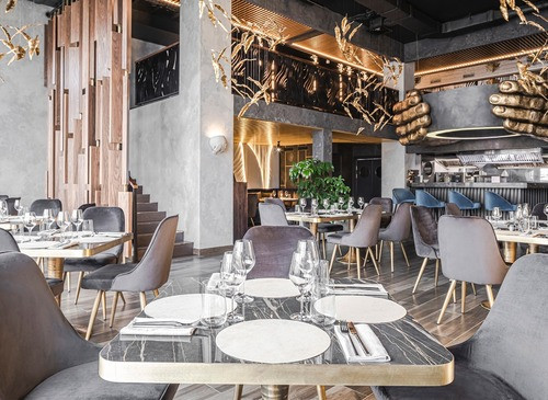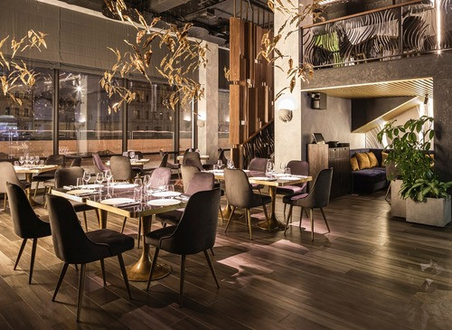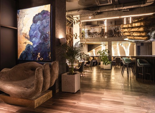 В двухуровневом ресторане в распоряжении режиссеров, актеров и операторов 4 отдельных зала, лаконичный контактный бар и витающие под высокими потолками золотые листья. Панорамный вид на урбанистический пейзаж дополняет уникальная концепция «прикосновения» к прекрасному, отражающаяся не только в интерьере и в деталях, но и в блюдах.